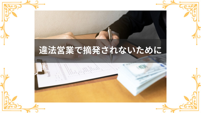 違法営業で摘発されると営業停止処分や罰金などの重大な処分を受ける可能性があるため、関連する法律を理解したうえで適切な営業をしなければいけません。
